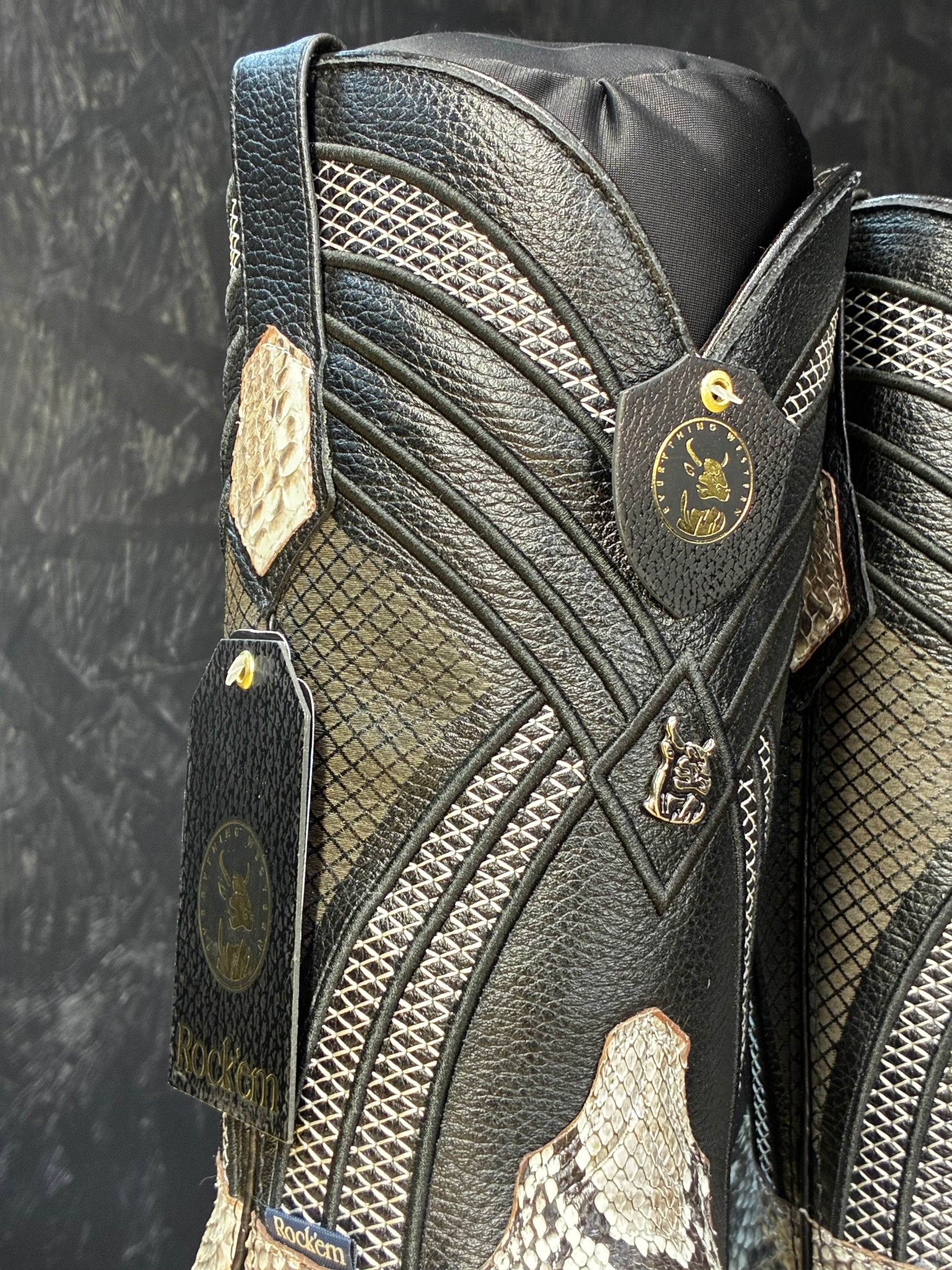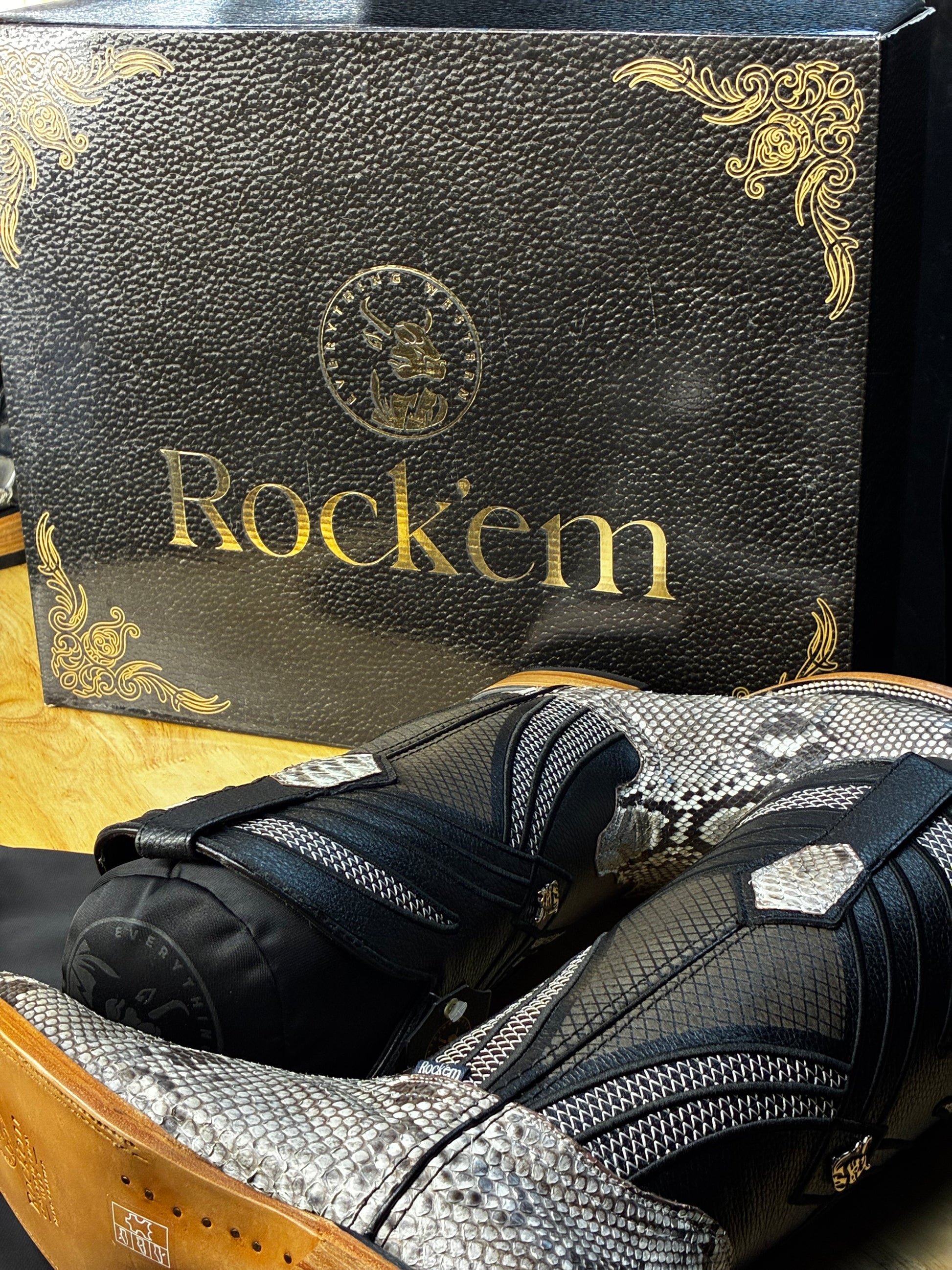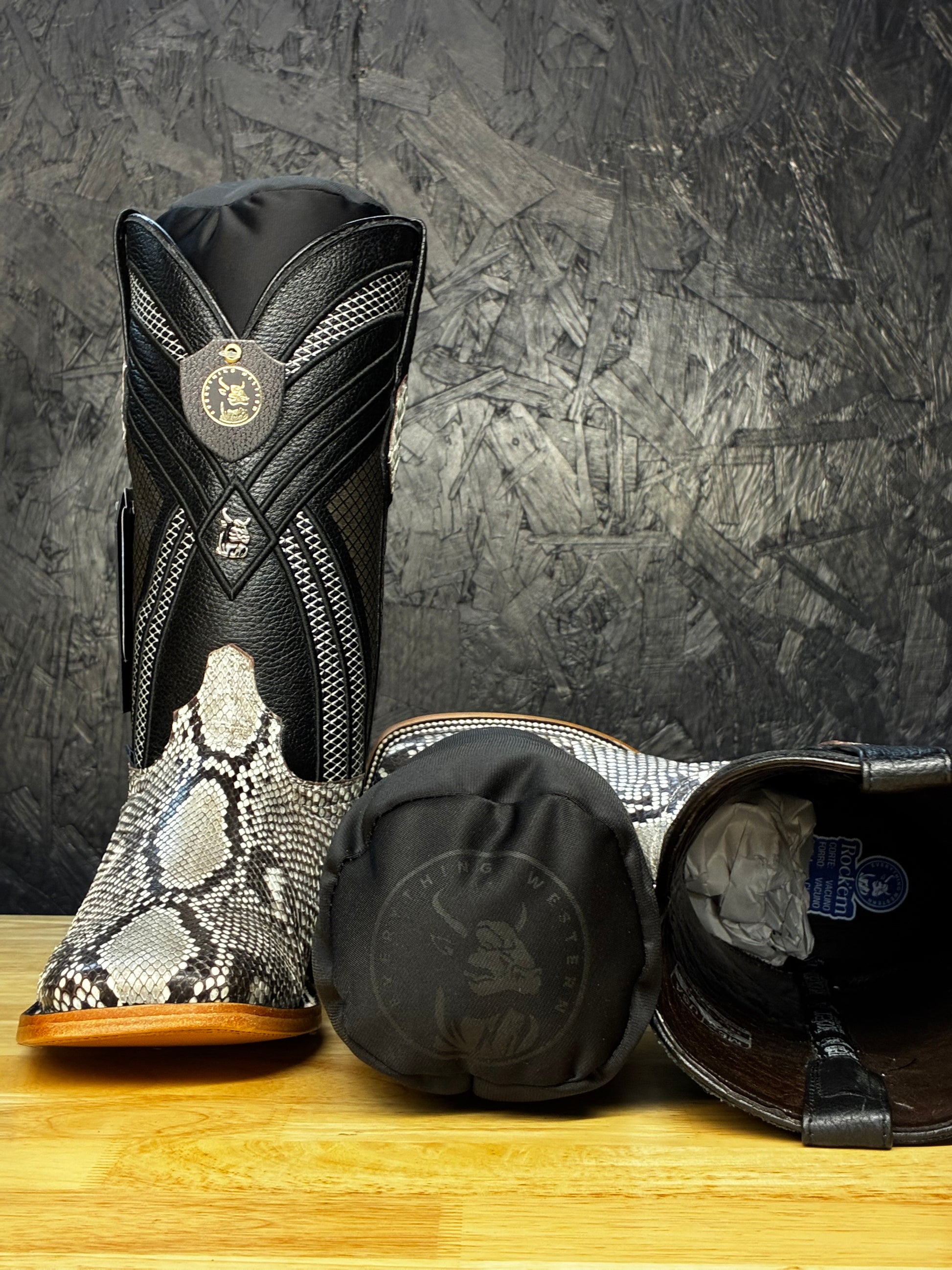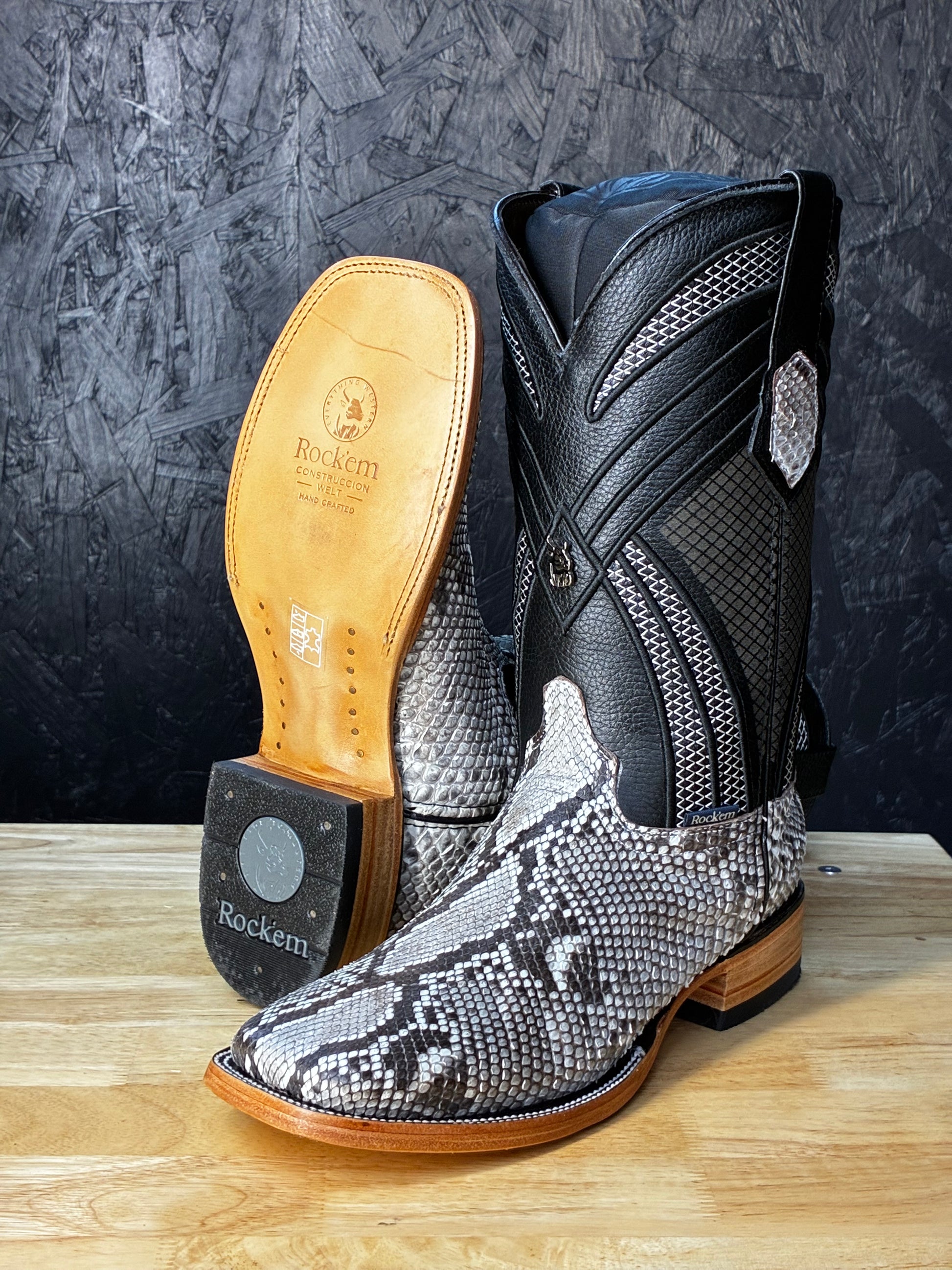 Featuring a naturally unique pattern with a combination of black, white, and grey marbled together to create a beautiful boot. Cut from the smoothest section of the python for a clean, elegant flow of pattern and tone. The exotic skin is expertly paired with a sharp square toe and a 1.5” stacked leather heel — blending classic Western spirit with modern, upscale energy.