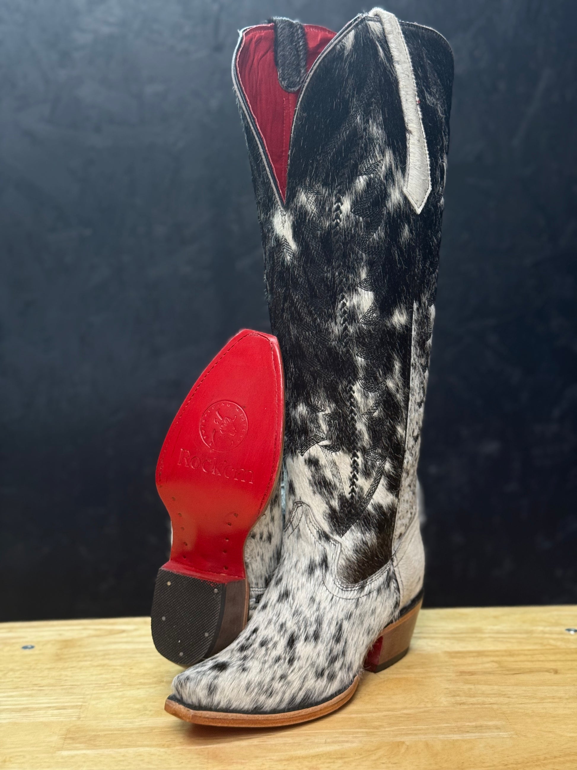 Where Western heritage meets elevated style — the Tall Red Bottom Cowhide Cowgirl Boot by Rock’em is designed for women who walk with presence. Handcrafted in León, Guanajuato, this striking boot features 100% genuine cowhide leather with natural fur that extends the full height of the shaft for a bold, fashion-forward silhouette.