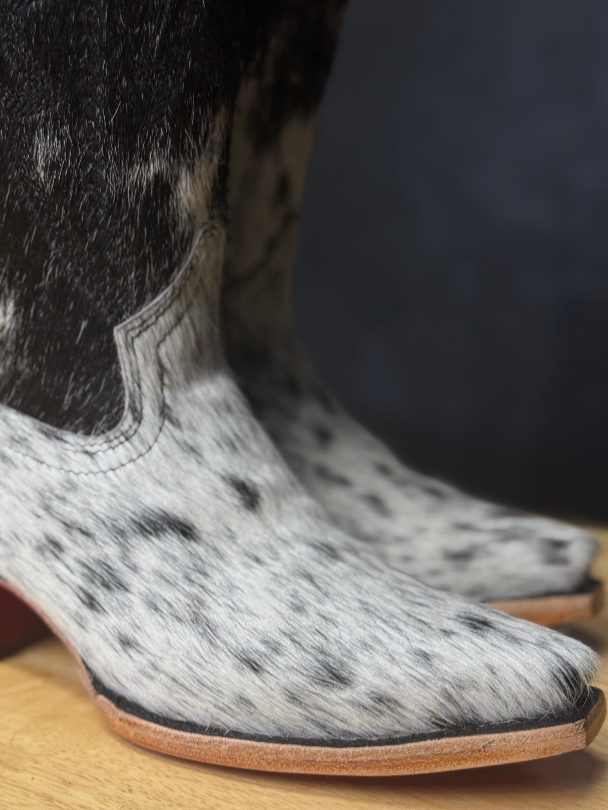 A snip toe and 2.5” stacked heel add a refined, feminine edge, while the signature red leather sole and matching red leather lining bring contrast and character. The inside zipper offers easy on-and-off without compromising style. Every pair is one-of-a-kind, thanks to the natural patterns of the hide — making these boots as unique as the woman wearing them.