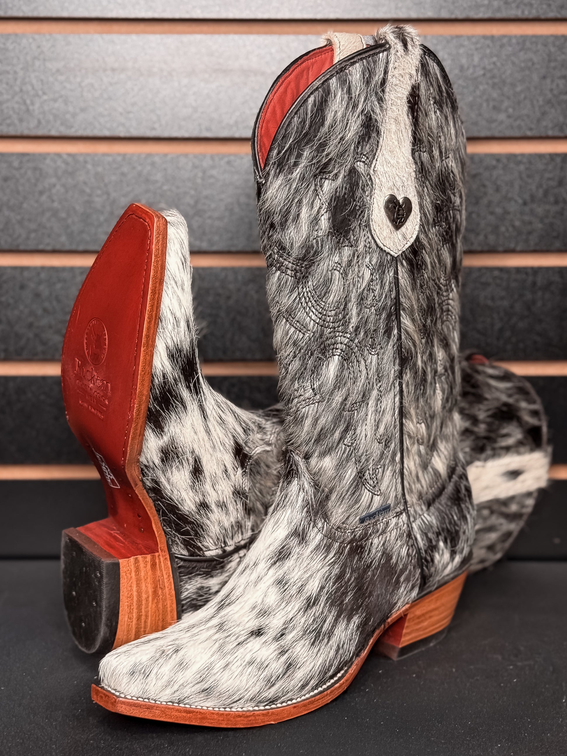 These Women's Snip Toe Cowhide Boots in the exclusive Red Bottom Edition tell a story all their own. Each pair is carefully crafted from handpicked cowhide, showcasing a unique, one-of-a-kind texture and natural beauty—no two pairs are ever the same. Expertly handcrafted by skilled artisans, these boots blend authentic Western craftsmanship with a modern, stylish edge, redefining Texas heritage for today’s confident, fashion-forward women.